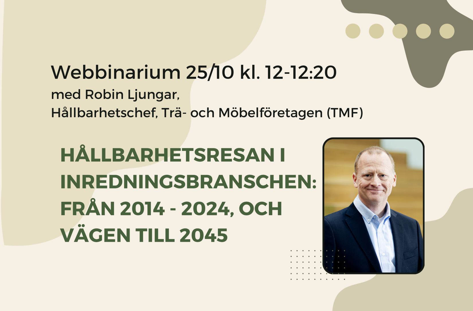 Hur såg hållbarhetsarbetet ut i möbel- och inredningsbranschen för 10 år sedan? Hur ser det ut idag? Vad behöver vi göra som inredningsarkitekter och producenter för att bidra till ett klimatneutralt Sverige år 2045? Välkommen när vi hör Robin Ljungar, Hållbarhetschef på TMF, berätta och resonera kring detta viktiga ämne.